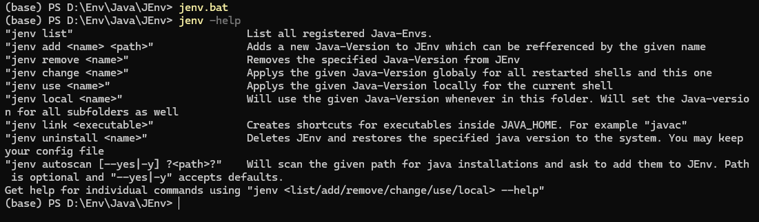 ?<path>?示例:jenv autoscan "C:\Program Files\Java"示例:jenv autoscan// 将搜索整个系统 示例:jenv autoscan -y "C:\Program Files\Java"// 将接受默认值