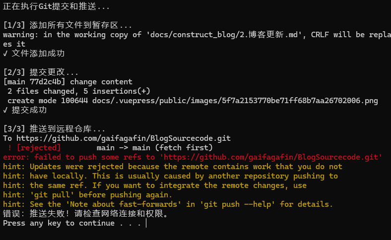 当推送时遇到如下报错,一般是push的内容与远程仓库上的内容产生冲突,需要自己分辨。一般建议是先使用上一小节第3点的安全替代方案。